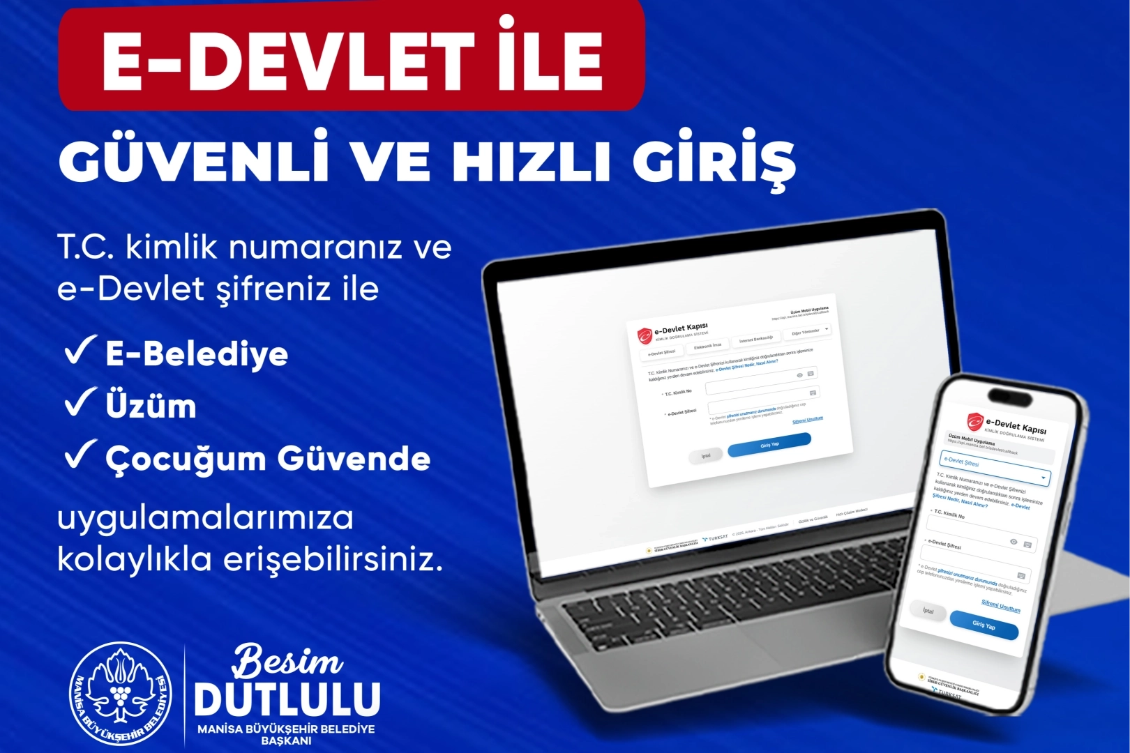 Yeni sistemle birlikte vatandaşlar, e-belediye işlemlerini ek bir hesap oluşturmaya gerek duymadan, ulusal kimlik doğrulama sistemi olan e-Devlet üzerinden güvenle gerçekleştirebilecek. Entegrasyon sayesinde; ‘E-Belediye’ hizmetleri, ‘Üzüm’ uygulaması ve ‘Çocuğum Güvende’ platformu, tek tıkla ve yüksek güvenlik standartlarıyla erişime açıldı.